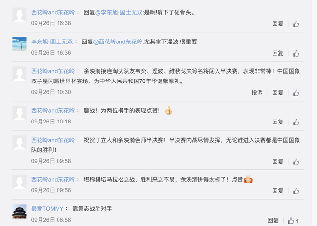 网友 西花岭and东花岭:两位中国男棋手同时跻身世界杯半决赛,第二型马尔科实现了中国男子国际象棋新突破,恭喜中国国际象棋队!遗憾的是同处上半区的丁立人和余泱漪半决赛将同室操戈,无论谁进决赛,希望中国棋手决赛加油好运,争取夺得冠军,创造中国国际象棋新的历史。